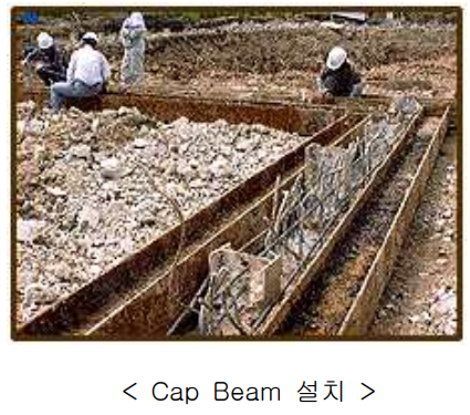 17) 흙막이벽 상단에 추락방지용 안전난간 설치할 경우 Cap 콘크리트 타설(캡 콘크리트)전 안전난간의 지주를 미리 설치합니다.