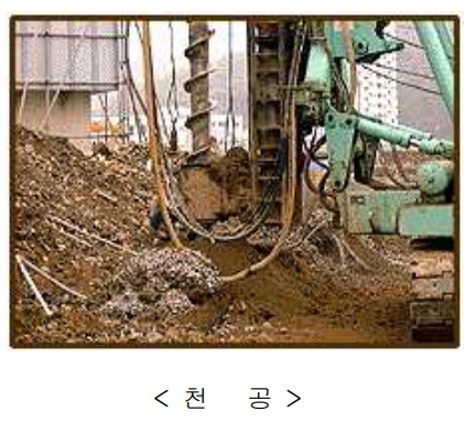 7) 장비 전도나 지하매설물을 보호하기 위해 천공장비가 위치하는 곳에는 철판을 설치하는 등의 방법으로 지반보강 조치를 해야합니다. 특히, 천공시 천공 깊이는 설계도서에서 정하는 깊이 이상을 확보하여야 하며 굴착토사를 관찰하는 등의 방법을 통해 설계단시 반영한 지층의 두께, 지질의 상태, 지하수위등과의 동일여부를 확인해야 합니다. 천공 깊이는 천공장비에 깊이를 표시하거나 시공하는 H pile에 길이를 표시하는함으로서 천공 깊이를 확인합니다.