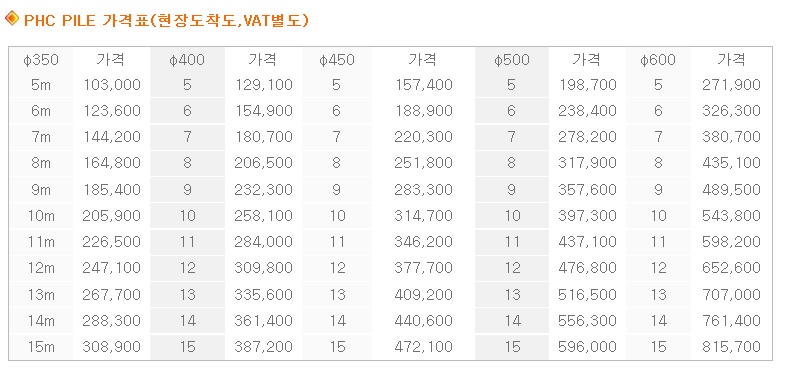 PHC파일 대일산업 http://www.di2002.co.kr PHC PILE 가격표(현장도착도,VAT별도) φ350 가격 φ400 가격 φ450 가격 φ500 가격 φ600 가격 5m 103,000 5 129,100 5 157,400 5 198,700 5 271,900 6m 123,600 6 15..
