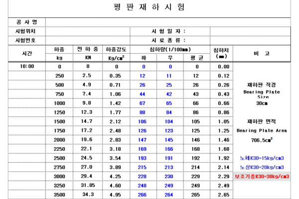 극한하중이나 항복하중 또는 현장지반의 예상최대하중에 도달할때까지 하중을 가하고 각 재하단계에서 하중과 침하량을 측정합니다. 침하량이 15분간 0.01mm보다 작아지면 안정된것으로 간주하고 다음 단계 하중을 재하합니다. 하중이나 침하율이 지지능력을 초과하거나 전체 침하량이 15mm 도달시 시험을 종료합니다.