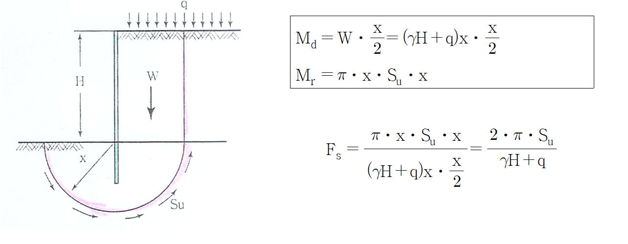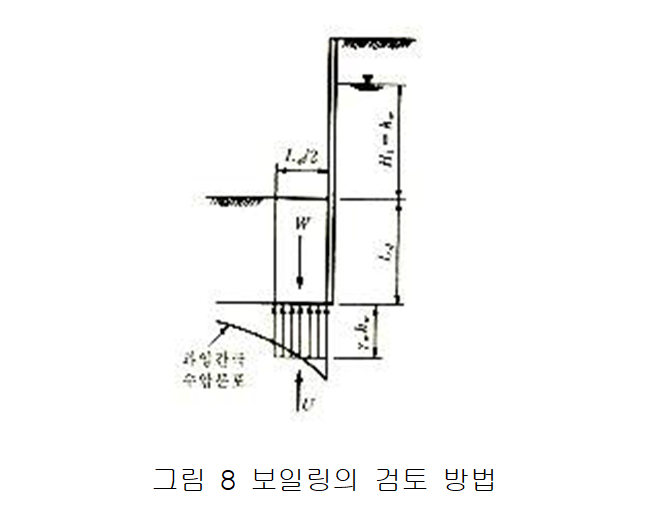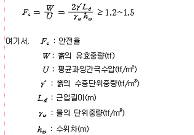 보일링을 검토하는 경우는 지하수위가 높은 사질토 일 때입니다. 보일링 검토는 Terzaghi에 의한 검토식을 사용합니다.