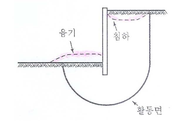 히빙은 영어로 Heaving이라고 표현합니다. Heaving의 사전적 의미를 보면, Heave는 들뜬다는 표현이며 Heaving이라고 하면 들뜸이라는 한국식 표현이 될 수 있습니다. 히빙은 연약한 점토 지반을 굴착할 때 굴착 배면 토 중량과 재하 중이 지반이 가진 전단강도보다 크게 되면 배면 지반은 침하되고 그리고 굴착면은 부풀어 오르는 현상이 일어납니다. 이런 현상은 단지 흙막이 공사뿐만 아니라 현장타설 말뚝의 케이싱을 설치할 때나 케이슨 기초를 침설 할 때 발생하기도 합니다. 굴착 저면, 즉 굴착지점에 점토가 있으며 그 지반 아래쪽에 피 압수를 가진 투수층이 존재하게 되면 이 피 압수에 의해 지반이 부풀어 오르는 것입니다. 단순하게 생각하면 히빙은 진흙놀이할 때 한쪽 부분을 누르게 되면 다른 한쪽이 볼록 올라오는 현상이라고 보시면 됩니다.