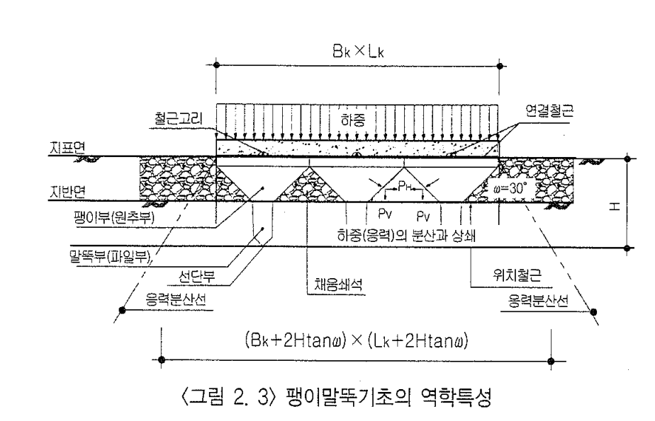 지내력이 부족한 지반위 쇄석층에 팽이말뚝의 팽이부가 잇으며 그 아래 지반층에는 팽이말뚝 말뚝부가 촘촘히 박혀있는 형태 입니다. 이때 상부와 하부는 철근으로 상호 결속되어 있기에 팽이말뚝기초는 유연성을 가진 강성지반구조로 볼수 있습니다. 팽이말뚝 팽이부 접지면은 45도 이기 때문에 접지면이 증가하게 되는데요 이는 마치 연약지반에서 사용되는 습지도저의 트랙과 같은 원리라고 할수 있습니다. 팽이말뚝 팽이부 45도 접지면으로 연직재하하중이 수평분력(Ph)와 수직분력(Pv)의 응력으로 나누어 지면서 수평분력은 서로 상쇄가 되는것이죠. 이는 곧 팽이말뚝기초에서 채워놓은 쇄성층과 팽이부의 접지면이 응력분산효과와 채움쇄석층과 말뚝부의 근입저항에 의해 측방유동억제를 기대할수 있게 되는것입니다. 즉, 팽이모양으로 인해서 응력분산효과와 측방유동억제라는 소기의 역학특성이 확실하게 이루어짐으로써 지지력 증대와 침하량 감소의 효과가 나타나는 이상적인 연약지반 기초공법이 되는 것입니다.