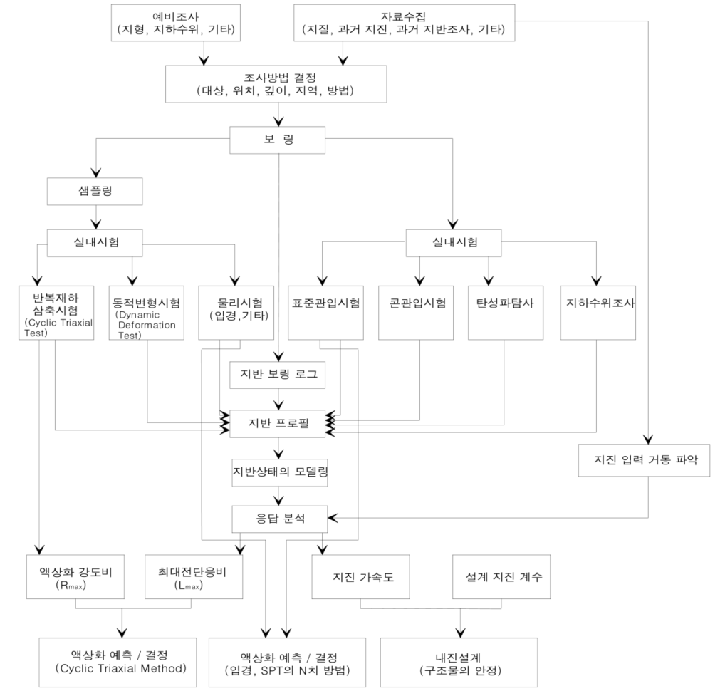 액상화 현상은 주로 사질토층에서 발생하기 때문에 사질토층 시험자료에 의한 액상화 평가기준으로 분석, 액상화 검토의 필요성 여부를 판정합니다.