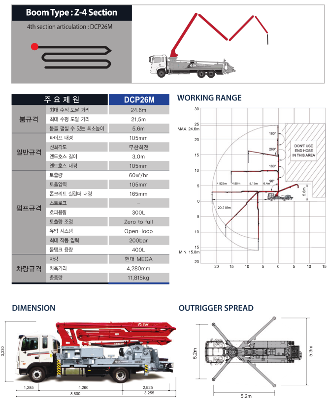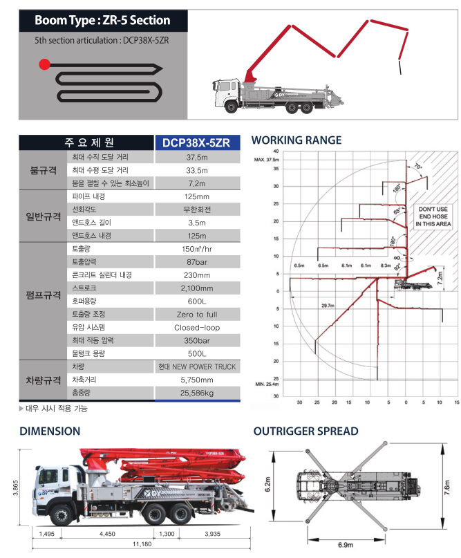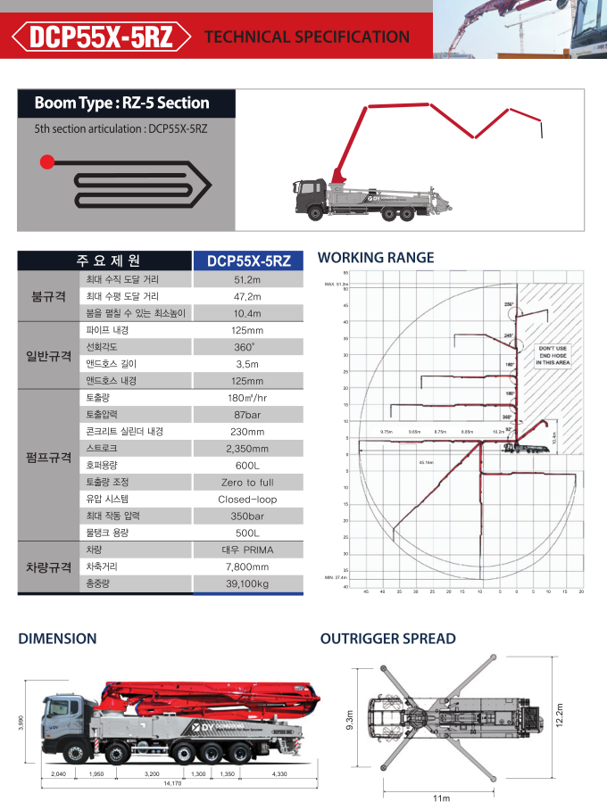 1) 펌프카(트럭탑재형) : 트럭과 압송장비 일체식으로 이동이 가능하며 수평 및 수직거리가 50m까지 가능합니다. 붐길이는 41m가 보편화 되어 있으니 50m는 9m나 길다고 보면됩니다. 아파트의 경우 1층당 약 3.5m를 작으면 약 10층까지도 커버가 가능합니다.