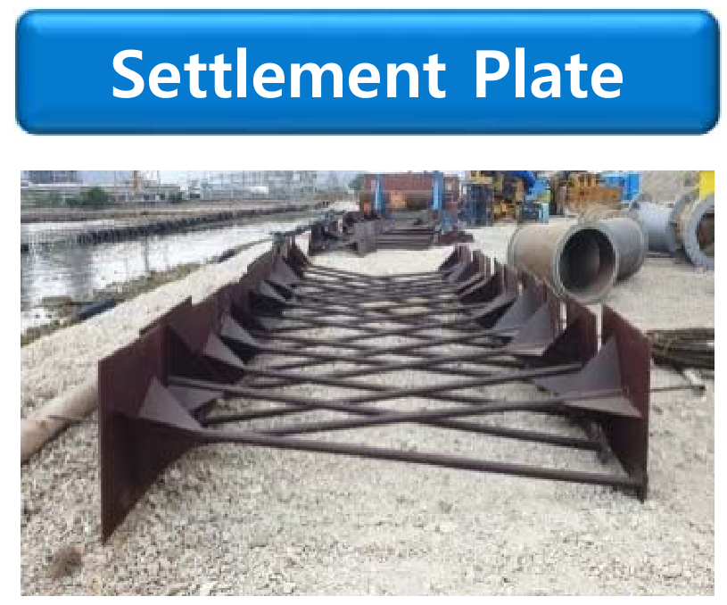 5) 지표면 침하판 : 설치지점의 전침하량을 측정하고 성토속도를 조절 재하(성토)하중 제거시기를 결정할수 있습니다.