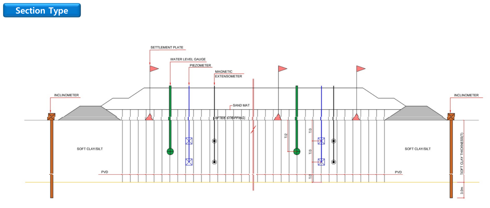 3) 간극수압계 : 성토하중에 의한 지반내 간극수압의 변화를 측정하고 과잉간극수압의 소산정도 및 유효응력증가량을 유추학수 있습니다. 압밀효과를 확인할수 있고 압밀 진행 및 강도증가를 확인할수 있습니다.