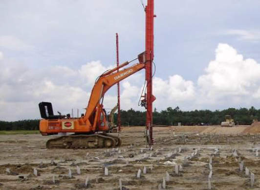 5) PBD타설 : 장비 맨드렐(Mandrel) 경사도 2도 이하를 유지합니다. 일반적인 PBD장비는 백호(1.35~1.7m3)를 개조한 장비로 앞뒤 방향은 리더를 움지여 경사도 수정이 가능하나 좌우방향은 B/H 장비 특성상 경사도 수정이 불가능하므로 수평배수층의 평탄성에만 의존해야합니다. 즉, 수평배수층의 평탄성이 중요합니다.(Trafficability). 소정위치까지 PBD를 타설하고 맨드렐 인발후에는 PBD를 수평배수층 상부 30cm이상(감독처에 따라 차이 있음)에서 절단하고 두부가 손상되지 않게 수평배수층내 매설해 보호해야 합니다. 수평배수층이 쇄석인 경우 180도 꺽어서 매설하고, 모래인 경우 90도로 눕혀서 매설합니다.