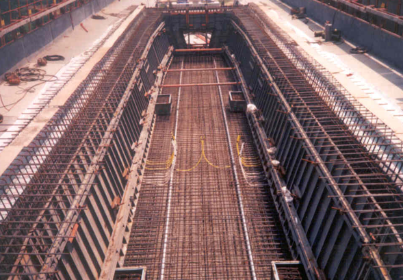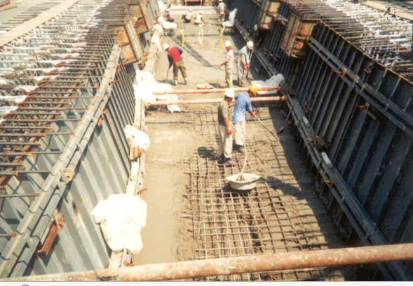 MSS 구조물 작업은 Bottom + Web + Slab로 구성되어 있고 콘크리트 타설법에는 일괄 타설과 분할타설이 있습니다. 분할타설의 경우 상부구조 Trough(Bottom+ Slab + Top Slab) 자중은 MSS가 부담하고 Top Slab 자중은 MSS 및 Trough가 동시에 부담하도록 하는 방식이비다. 상부구조 구조해석 및 Cabber 검토가 일괄타설의 경우보다 상당히 복잡하지만 일괄타설에 비해 Camber량이 적고 일괄타설에 비해 콘크리트 생산관리가 용이합니다. 하지만 시공이 일괄타설에 비해 복잡하고 외부 거푸집이 다수의 강봉으로 지지되어야 하므로 Diaphragm Hole을 통해 내부 거푸집의 인출이 불가능하며 콘크리트 2회 타설 및 양생으로 시공속도가 느립니다. 일괄 타설의 경우 상부구조 Trough(Bottom Slab - Top Slab) 및 Top Slab의 자중을 오로지 MSS가 부담하도록 하는 방식으로 상부구조 구조해석 및 Camber 검토가 분할타설보다 쉽습니다. 또한 시공이 분할타설에 비해 간편하고 전반적으로 MSS운영이 쉽습니다. 시공 속도가 빠르며 시공 실적이 많습니다. 하짐나 분할타설에 비해 일괄타설하기에 처짐량이 많고 Camber량이 많습니다.
