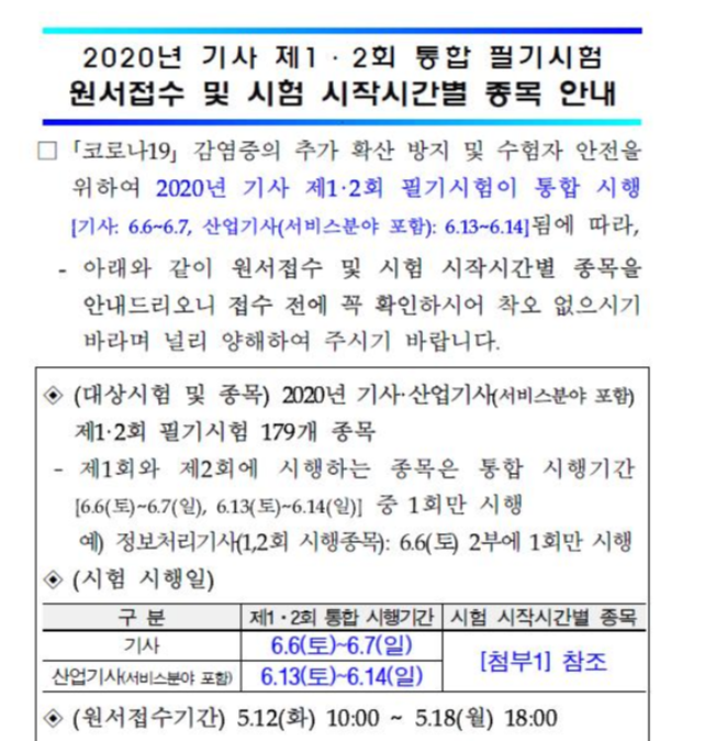 2020년 기사일정입니다. 이번에는 코로나 19 예방을 위해 20년 기사 산업기사 제 1,2회 필기시험은 통합시행