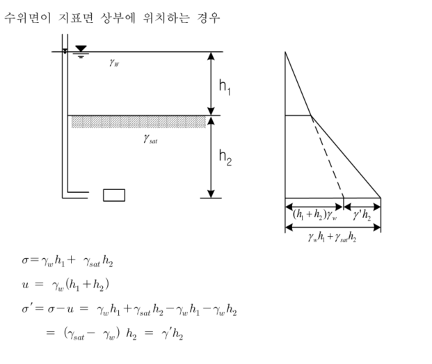 지하수위가 지표면에 있고, 표면이 수평한 토층에서 깊이 z에서 전 연즉응력은 그 깊이의 단위 면적 위에 쌓여있는 흙입자와 물을 더한 무게입니다. 흙입자 사이 공극은 서로 연결되어 있기에 간극수압은 정수압 상태를 유지할수 있습니다.