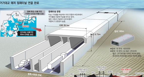부산 거제간 연결도로 침매터널은 대한민국 토목인의 자랑입니다. 건설을 하기 위해 수많은 노력과 땀을 흘리셨을 시공사, 감리, 설계사에 박수를 보냅니다 .